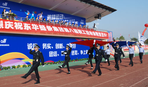 開幕式上,隨著高亢激昂的運動員進行曲響起,國旗隊、廠旗隊、舞蹈隊、東華黨群服務(wù)驛站代表隊、各分工會代表隊等共19支方隊有序入場。各代表隊員工精神飽滿,口號響亮,步伐整齊,展示出東華員工朝氣蓬勃的精神風(fēng)貌。