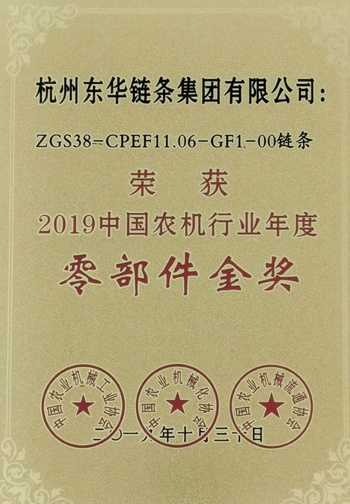 展會(huì)期間,舉行了2019中國農(nóng)機(jī)行業(yè)年度頒獎(jiǎng)典禮,東華生產(chǎn)的ZGS38-CPEF11.06-GF1玉米收獲機(jī)用鏈條榮獲“2019中國農(nóng)機(jī)行業(yè)年度零部件金獎(jiǎng)”,是鏈條行業(yè)唯一獲此殊榮的產(chǎn)品,是中國農(nóng)機(jī)行業(yè)的最高榮譽(yù)。該產(chǎn)品具有結(jié)構(gòu)新,用途巧等特點(diǎn),是東華近年來研發(fā)的高端鏈條產(chǎn)品。
