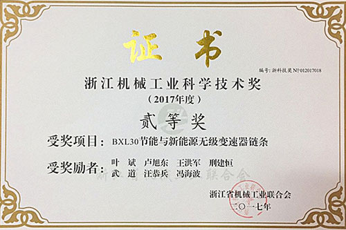 又訊:日前,公司生產(chǎn)的BXL30節(jié)能與新能源無級變速器鏈條被浙江省機械工業(yè)聯(lián)合會評為“浙江機械工業(yè)科學技術獎貳等獎”。